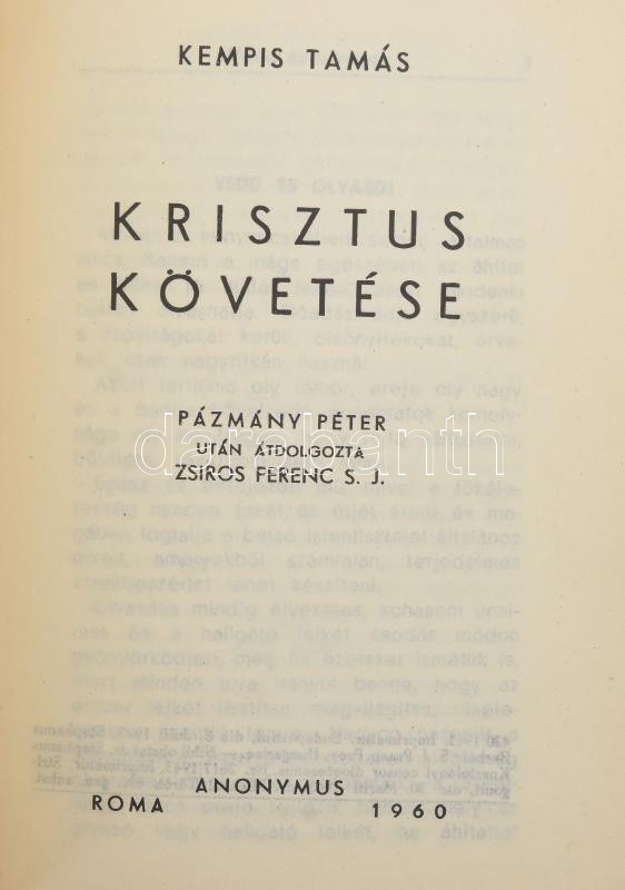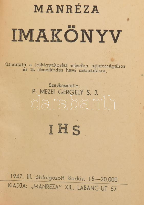 Manréza imakönyv. Szerk.: Mezei Gergely. Bp., 1947, Manreza, 374 p. Félvászon-kötésben, festett lapélekkel, kissé sérült, kopottas borítóval. + Kempis Tamás: Krisztus követése. Pázmány Péter után átdolgozta: Zsíros Ferenc. Róma, 1960, Anonymus, 320 p. Nyl-kötésben.