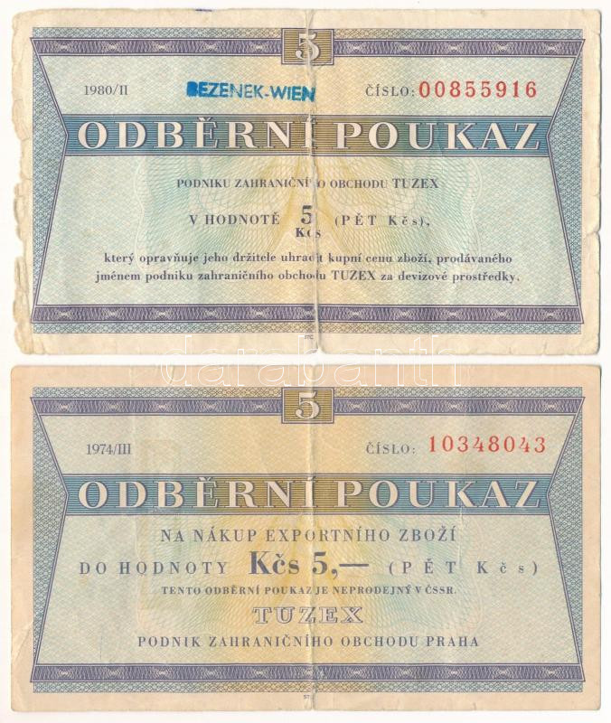 Csehszlovákia 1974-1980. 5K (2xklf) "TUZEX" vásárlási utalvány, egyiken "BEZENEK-WIEN" felülbélyegzés T:VG, ragasztott