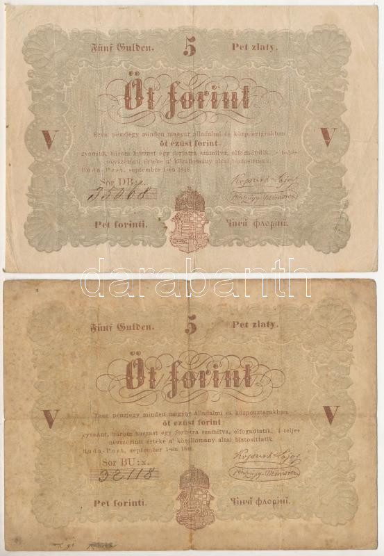 https://www.darabanth.com/en/480-Online-auction/480.0/Numismatics/Hungarian-Banknotes~2000009/1848-5Ft-Kossuth-banko-barna-nyomat-2x-T-F-VG-beszakadasok-lyuk-kisebb-anyaghianyAdamo-G109A~II3258947