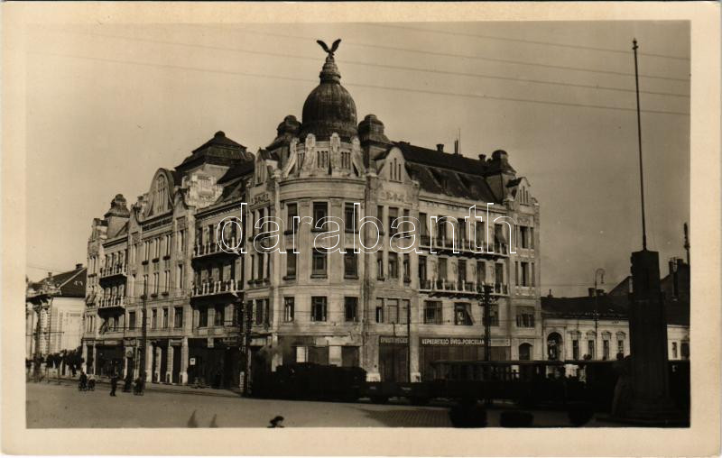 Description: Nyíregyháza, Nyírvíz palota a Szabadság téren, Épületüveges, Képkeretező, üveg és porcelán, teherfuvar és Sándorffy üzlete, MÁV Nyírvidéki kisvasúti vegyesvonat szerkocsis gőzmozdony vontatással