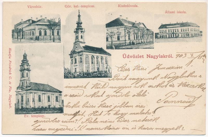 Description: 1903 Nagylak, Nadlac; Városháza, görögkeleti és ágostai hitvallású evangélikus templom, kisdedóvoda, állami iskola. Friedrich G. és fia kiadása / town hall, churches, kindergarten, school
