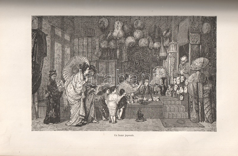 Brassey, [Anna Allnutt]: Le tour du monde en familie. Voyage de la famille Brassey dans son yacht Le Sunbeam. Reconté par la mere. Traduit de l'anglais par M. Richard Voit. Illustré de 78 gravures sur bois. Tours, 1885. Alfred Mame et Fils. 414 + [2] p. Egyetlen francia kiadás. Anna Brassey (1839-1887) angol útiíró. Utazásait több illusztrált kötetben örökítette meg. Ebben a kötetében 1876-1877 során megtett Föld körüli utazásának állít emléket, melynek során családja, gyermekei, férje és népes legénység társaságában nyugati irányban kerülték meg a Földet. A család Madeiráról indult, Rio de Janeiro, Buenos Aires, Tűzföld, Santiago de Chile, Tahiti, az ausztrál part, Hawaii, Japán, Kína, Kanton, Szingapúr, végül Kairó érintésével tértek vissza a Földközi-tengerre, majd dél-angliai udvarházukba. Az úti beszámoló képanyaga a Verne-kalandregények modorában készült. Az első előzéken régi tulajdonosi bejegyzés. Aranyozott, festett, sérült gerincű, enyhén kopott kiadói egészvászon kötésben, aranyozott festésű lapszélekkel. Jó példány.