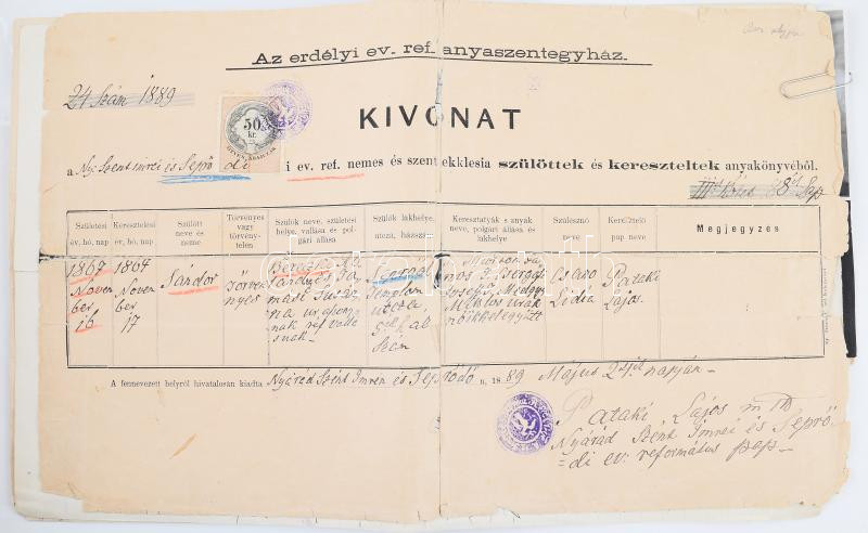 Description: ca 1940 Torboszlói Bereczky Roland (sz: 1844) és feleségének és Tamási Zsuzsnnának házasságából született Bereczky Sándor és felesége Papp Aranka Gizella (Sz: 1876) kivonatai, fényképek, halotti értesítők, stb, össz 8 db dokumentum.