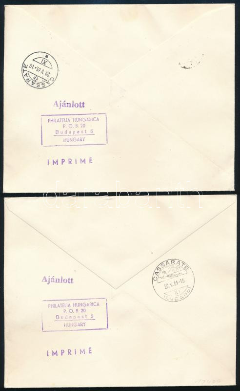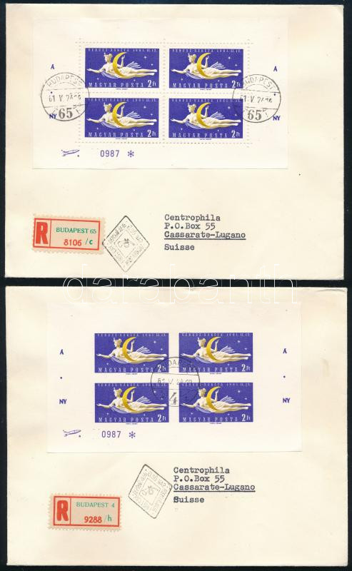 Description: 1961 Vénusz-rakéta Á.NY fogazott és vágott kisív rakétával, csillaggal, azonos 0987 sorszámmal felülnyomva 2 db ajánlott légi FDC-n Svájcba. Nagyon ritka kínálat!!!