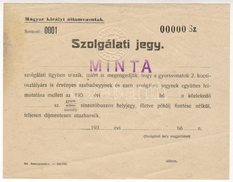 1930-as évek Magyar Királyi Államvasutak - szolgálati jegy "000-ás" Mi...