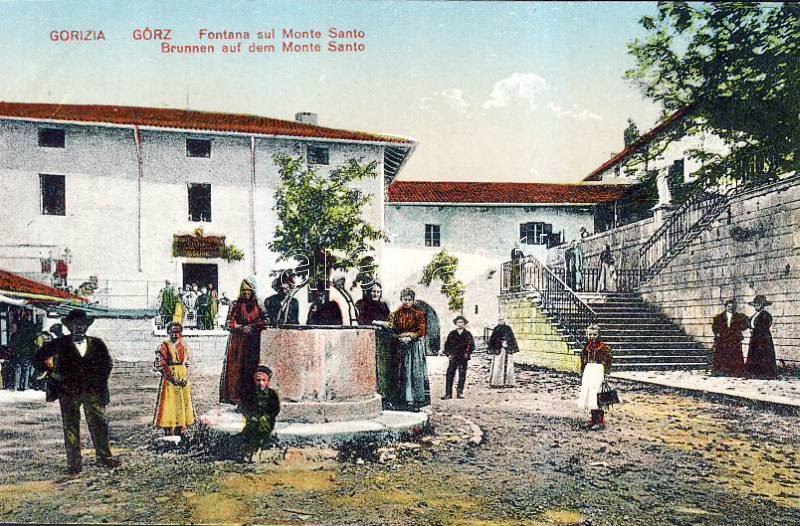 Leírás: Gorizia fountain at Monte Santo with guesthouse and café