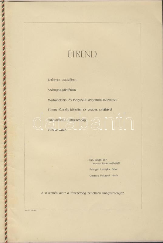 1920.03.07 Az egy héttel korábban kormányzóvá választott Horthy Miklós tiszteleletére a Nemzeti Hadsereg FÅ‘vezérségének tisztikara által rendezett dÃszebéd menükártyája, Horthy Miklós saját kezű aláÃrásával továbbá Nagy Pál tábornok elsÅ‘ világháborús hadosztályparancsnok, Zadravecz István ferences szerzetes, tábori püspök saját kezű aláÃrásaival / Menu card of the exclusive lunch organised for the election of Miklos Horthy as governor with original signature of Miklos Horthy, Pál Nagy general, János Zadravetz field-bishop