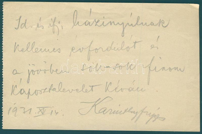 1931 Karinthy Frigyes saját kezű köszöntő sorai és aláírása / Autograp... https://www.darabanth.com/hu/10-Nagyaukcio/10.1/Magyar-filatelia-es-postatortenet/Filateliai-es-tortenelmi-dokumentumok-keziratok-alairasok-1734-1932-Philatelic-and-historic~2912/1931-Karinthy-Frigyes-sajat-kezu-koszonto-sorai-es-alairasa-Autograph-letter-of-Frigyes-K~II265279