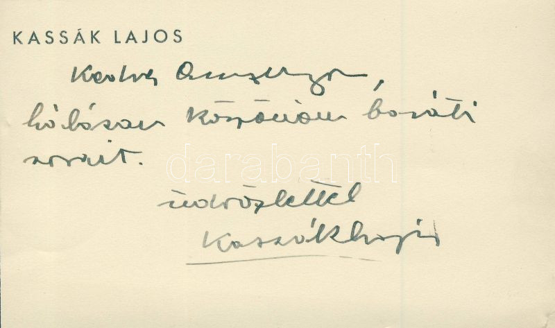 Kassák Lajos saját kezű köszönő sorai és aláírása névjegykártyáján / S... https://www.darabanth.com/hu/10-Nagyaukcio/10.1/Magyar-filatelia-es-postatortenet/Filateliai-es-tortenelmi-dokumentumok-keziratok-alairasok-1734-1932-Philatelic-and-historic~2912/Kassak-Lajos-sajat-kezu-koszono-sorai-es-alairasa-nevjegykartyajan-Signature-and-man~II265269
