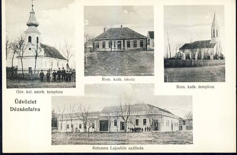 Dézsánfalva with churches and the hotel of Lajos Kelemen https://www.darabanth.com/hu/10-Nagyaukcio/10.1/Magyar-kepeslapok/Erdely-Transylvania~2738/Dezsanfalva-with-churches-and-the-hotel-of-Lajos-Kelemen~II301899