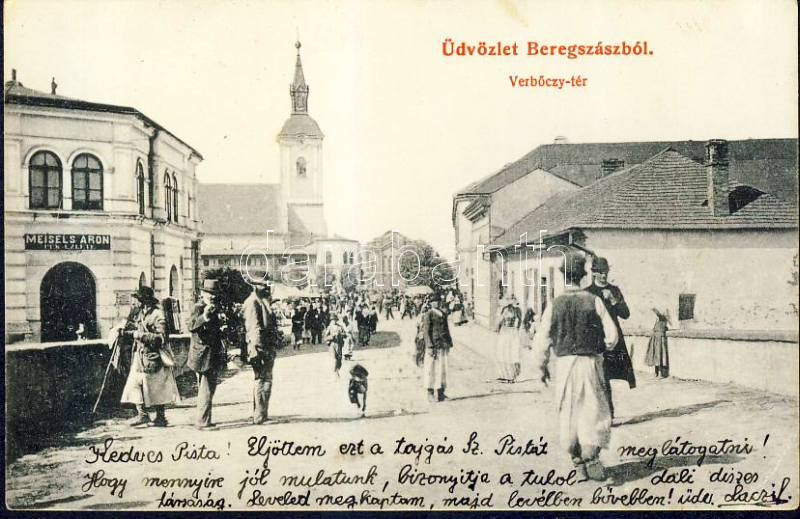 Beregszász with synagogue and the bakery of Áron Meisels (EB) https://www.darabanth.com/hu/10-Nagyaukcio/10.1/Magyar-kepeslapok/Karpatalja-Carpatho-Ukraine~2740/Beregszasz-with-synagogue-and-the-bakery-of-Aron-Meisels-EB~II302198
