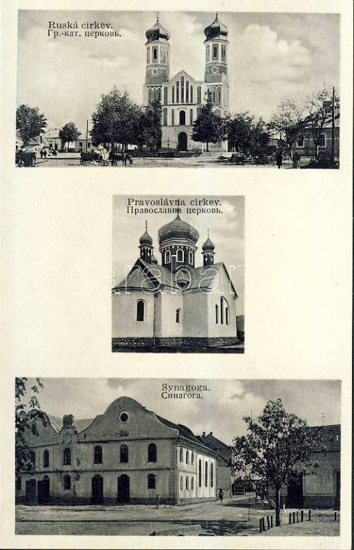 Huszt with Synagogue, Russian church and Orthodox church https://www.darabanth.com/hu/10-Nagyaukcio/10.1/Magyar-kepeslapok/Karpatalja-Carpatho-Ukraine~2740/Huszt-with-Synagogue-Russian-church-and-Orthodox-church~II302249
