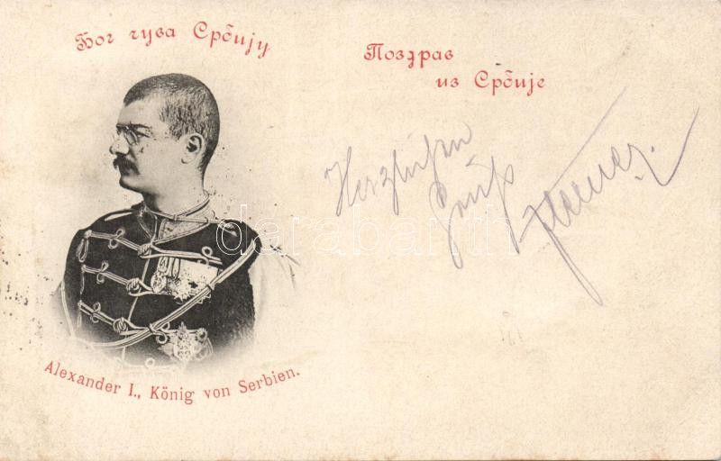 1898 Alexander I. king of Serbia https://www.darabanth.com/hu/10-Nagyaukcio/10.1/Motivum-kepeslapok/Uralkodo-politikus-Royalty-politician~2832/1898-Alexander-I-king-of-Serbia~II299800
