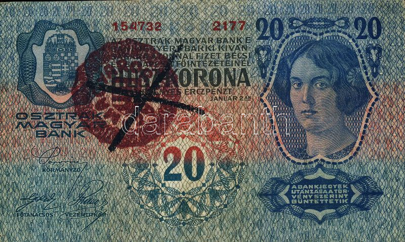 1913. 20K piros "Magyarország" körbélyegzővel+"Andráskereszttel(hamis?... https://www.darabanth.com/hu/100-Gyorsarveres/100.0/Numizmatika/Osztrakmagyar-magyar-es-magyar-vonatkozasu-bankjegyek-Austrian-Hungarian-Hungarian-and~100021/1913-20K-piros-Magyarorszag-korbelyegzovelplusAndraskereszttelhamis-TII-IIIplus~II233831