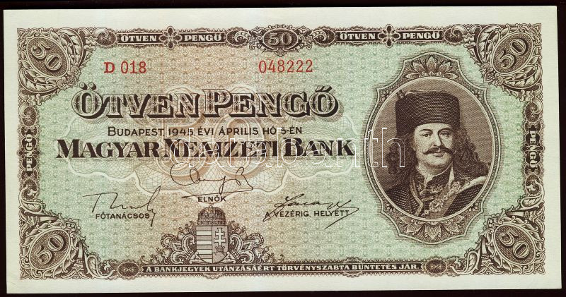 1945. 50P T:I- (alig látható sarokhajlás) https://www.darabanth.com/hu/100-Gyorsarveres/100.0/Numizmatika/Osztrakmagyar-magyar-es-magyar-vonatkozasu-bankjegyek-Austrian-Hungarian-Hungarian-and~100021/1945-50P-TI-alig-lathato-sarokhajlas~II235456