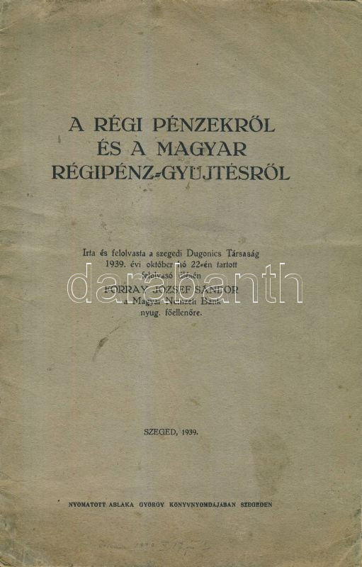 Forray József Sándor: A régi pénzekről és a magyar régipénz-gyűjtésről... https://www.darabanth.com/hu/101-Gyorsarveres/101.0/Numizmatika/Numizmatikai-irodalom~30009/Forray-Jozsef-Sandor-A-regi-penzekrol-es-a-magyar-regipenz-gyujtesrol-1939~II239805