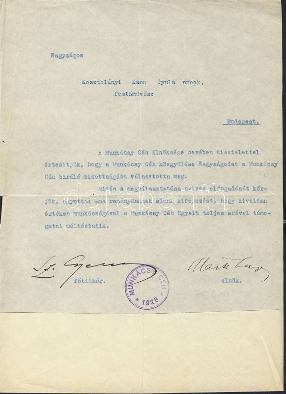 Leírás: 1928 Sz. Gyenes Lajos festő aláírása Munkácsy céh papírján