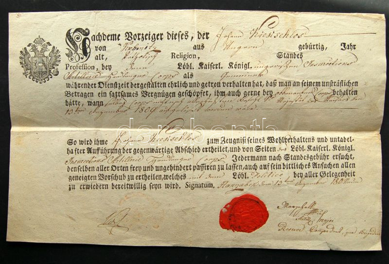 1809 Önkéntes katona leszerelő és útlevele / Disarming letter https://www.darabanth.com/hu/103-Gyorsarveres/103.0/Festmeny-mutargy-papirregiseg-egyeb/Okmanyok-Documents~100134/1809-Onkentes-katona-leszerelo-es-utlevele-Disarming-letter~II249971