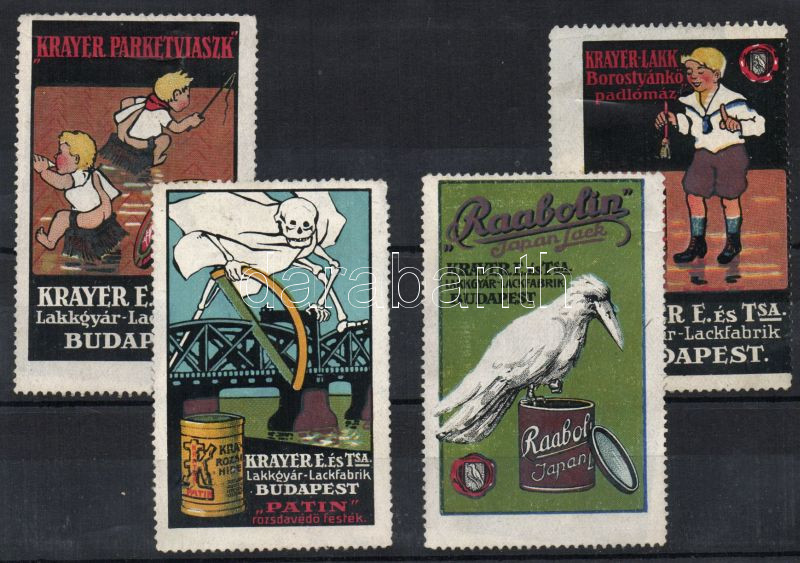 1910 Krayer lakkgyár 4 db levélzáró https://www.darabanth.com/hu/103-Gyorsarveres/103.0/Festmeny-mutargy-papirregiseg-egyeb/Parafilatelia-Paraphilately~100132/1910-Krayer-lakkgyar-4-db-levelzaro~II246270