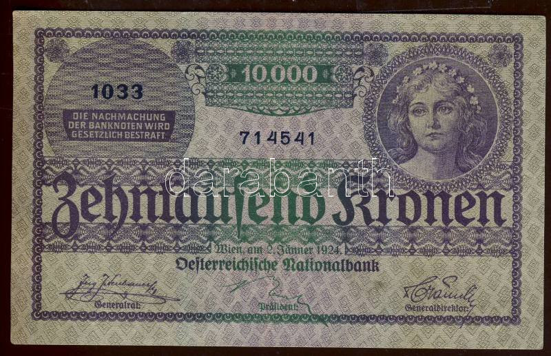 Ausztria 1924. 10.000K T:II+ https://www.darabanth.com/hu/103-Gyorsarveres/103.0/Numizmatika/Kulfoldi-bankjegyek~40007/Ausztria-1924-10000K-TIIplus~II252532