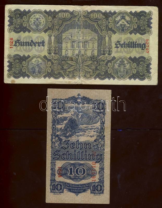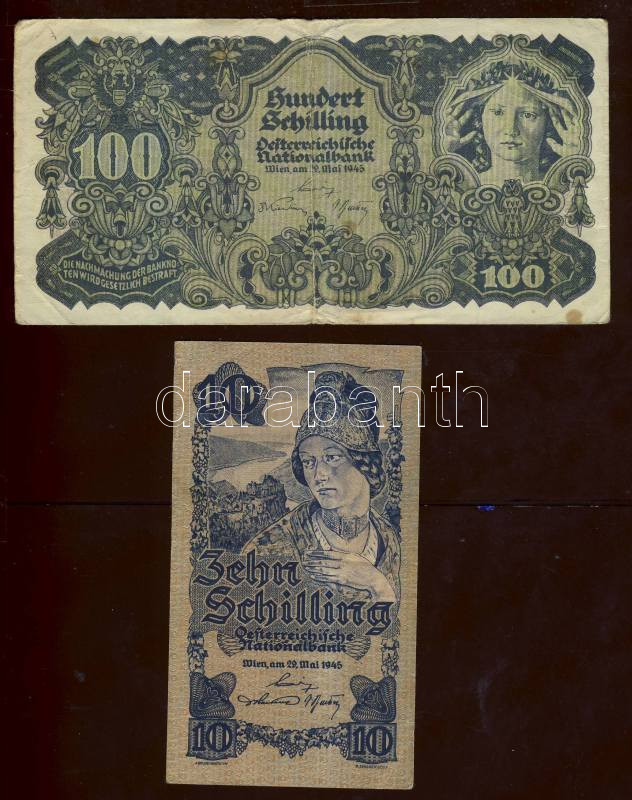 Ausztria 1945. 10Sch T:II-/III+ + 100Sch T:III https://www.darabanth.com/hu/103-Gyorsarveres/103.0/Numizmatika/Kulfoldi-bankjegyek~40007/Ausztria-1945-10Sch-TII-IIIplus-plus-100Sch-TIII~II252501