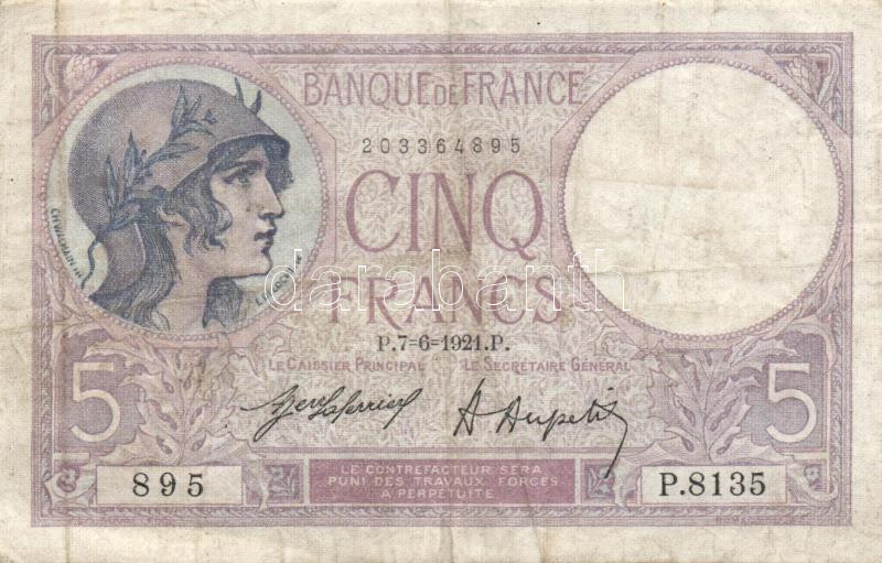 Franciaország 1921.6.7. 5Fr T:III https://www.darabanth.com/hu/108-Gyorsarveres/108.0/Numizmatika/Kulfoldi-bankjegyek~6006/Franciaorszag-192167-5Fr-TIII~II269929