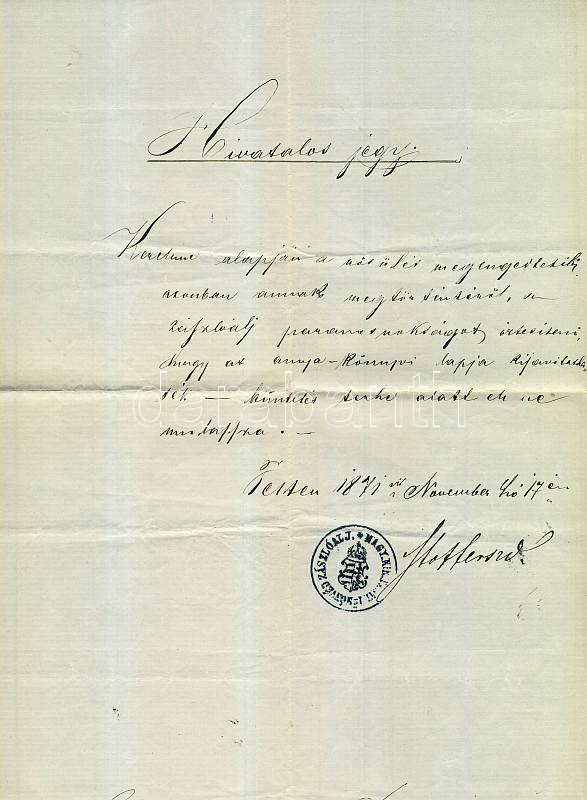 Leírás: 1871 Budapesti Honvéd Zászlóalj hivatalos jegye Stosser százados aláírásával