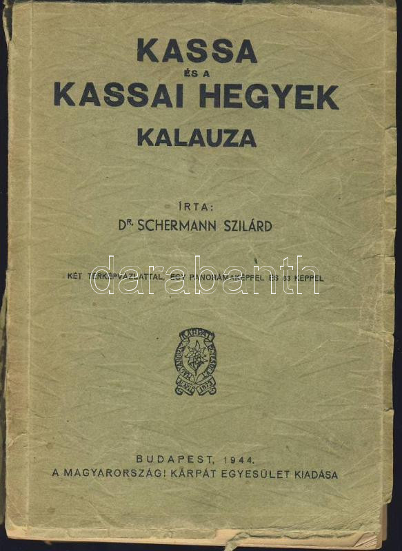 1944 Dr. Schermann Szilárd: Kassa és a kassai hegyek kalauza könyv, térképvázlatokkal és képekkel a Magyarországi Kárpát Egyesület kiadásában, sérült gerinccel