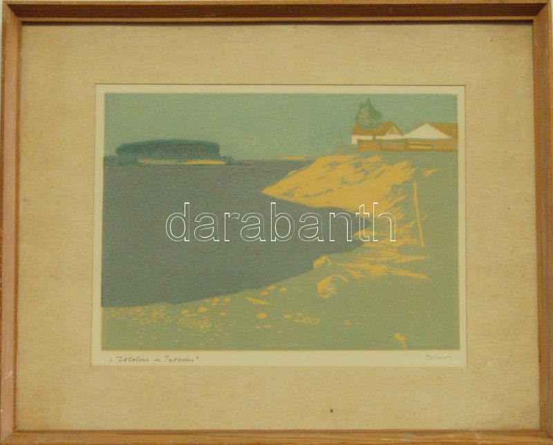 Leírás: Bikus? jelzéssel: Zöldár a Tiszán színezett metszet, papír, keretben 53x42 cm