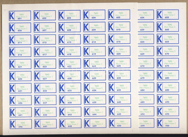 Leírás: A megszűnt Pécs Vasas 2 postahivatal 2 teljes 50-es ív öntapadós "K" ragjegye