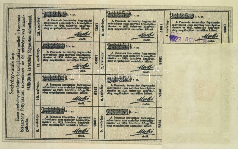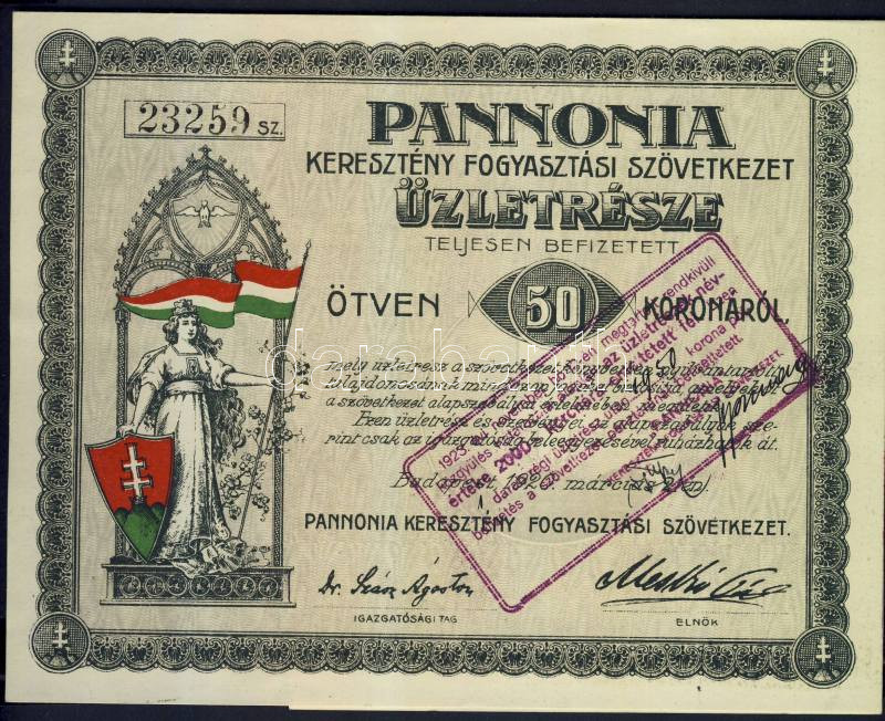 1920. "Pannonia Keresztény Fogyasztási Szövetkezet" üzletrésze 50K-ról... https://www.darabanth.com/hu/111-Gyorsarveres/111.0/Numizmatika/Reszvenyek-ertekpapirok-sorsjegyek-takarekbetetkonyvek-csekkek-valtok-Stocks-securities-~1000200/1920-Pannonia-Kereszteny-Fogyasztasi-Szovetkezet-uzletresze-50K-rol-szelvenyekkel~II282145