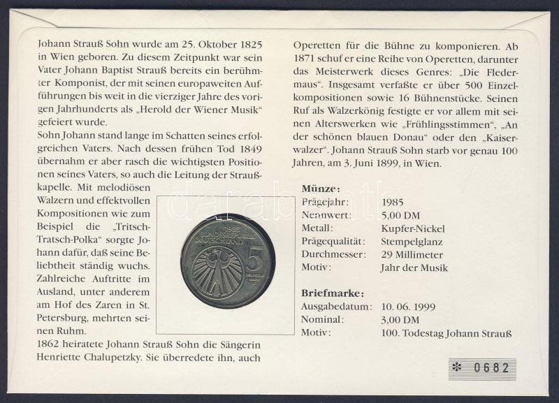 Leírás: NSZK 1985. 5M "A zene éve" bélyeges érmés borítékon elsőnapi bélyegzővel, hátoldali ismertető tanúsítvánnyal T:BU
