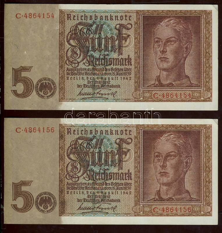 Német 3. Birodalom 1942. 5RM (2x) kis ugrású sorszámokkal T:II https://www.darabanth.com/hu/112-Gyorsarveres/112.0/Numizmatika/Nemet-BirodalomCsaszarsagWeimari-KoztarsasagNemet-Allamok-bankjegyei-papir-es-fem-szuksegpenzei~407/Nemet-3-Birodalom-1942-5RM-2x-kis-ugrasu-sorszamokkal-TII~II284605