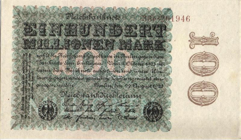 Leírás: Német Birodalom / Weimari Köztársaság 1923. 100.000.000M (2x) cégnyomat hátoldali fázercsíkkal, egymás utáni sorszámokkal T:I