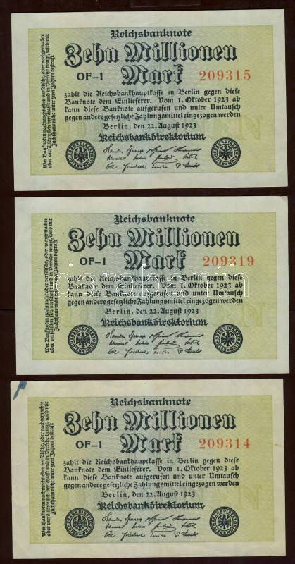 Leírás: Német Birodalom / Weimari Köztársaság 1923. 10.000.000M (3x) "Wellen" vízjellel, egymás utáni ill. kis ugrású sorszámokkal T:I,II+,II