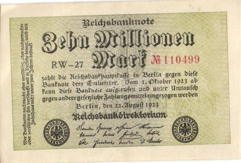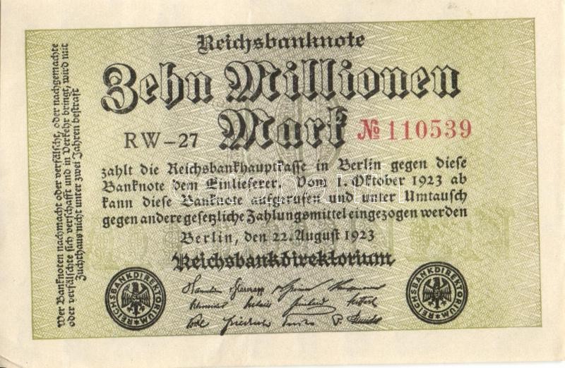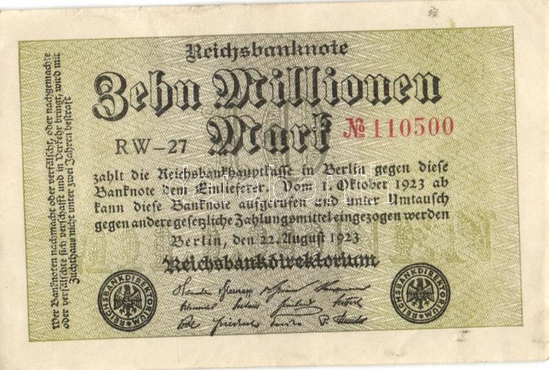 Leírás: Német Birodalom / Weimari Köztársaság 1923. 10.000.000M (5x) egymás utáni ill. kis ugrású sorszámokkal, vágáshibával T:I,I-,II