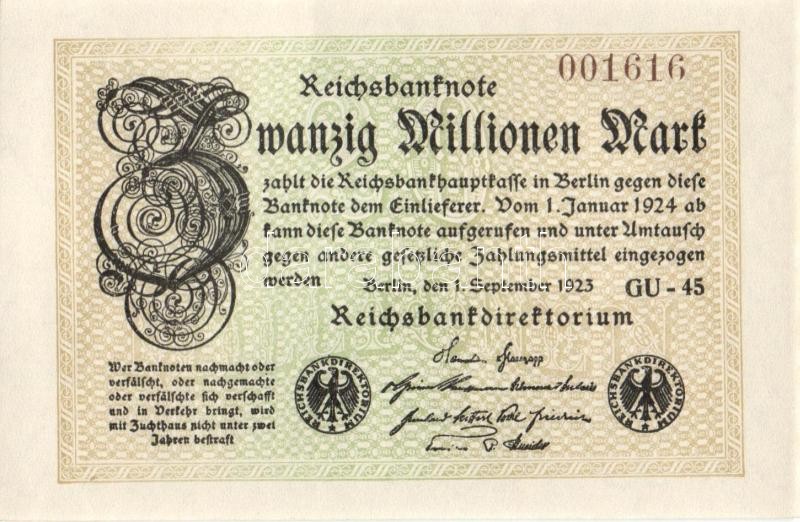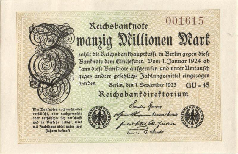 Leírás: Német Birodalom / Weimari Köztársaság 1923. 20.000.000M (2x) "Gitter mit 8" vízjellel, egymás utáni sorszámokkal T:I
