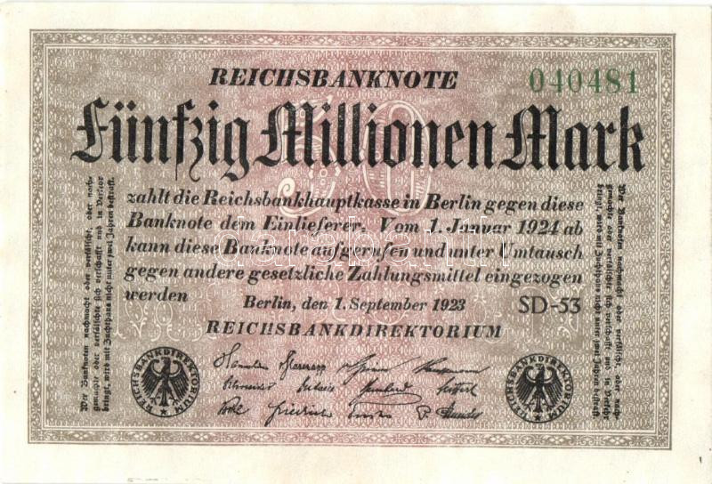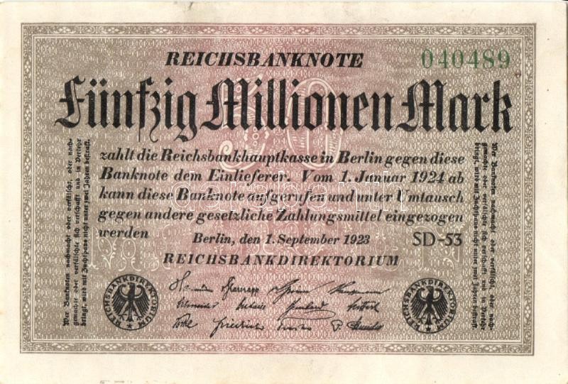 Leírás: Német Birodalom / Weimari Köztársaság 1923. 50.000.000M (2x) kis ugrású sorszámokkal T:I-