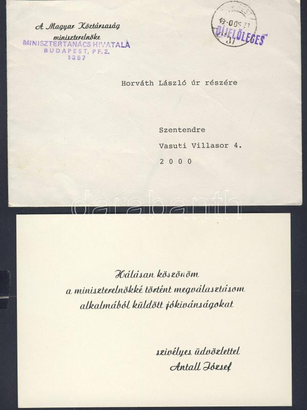 Leírás: Antall József miniszterelnök köszönőlevele A Magyar Köztársaság miniszterelnöke jelzéssel ellátott eredeti borítékjában