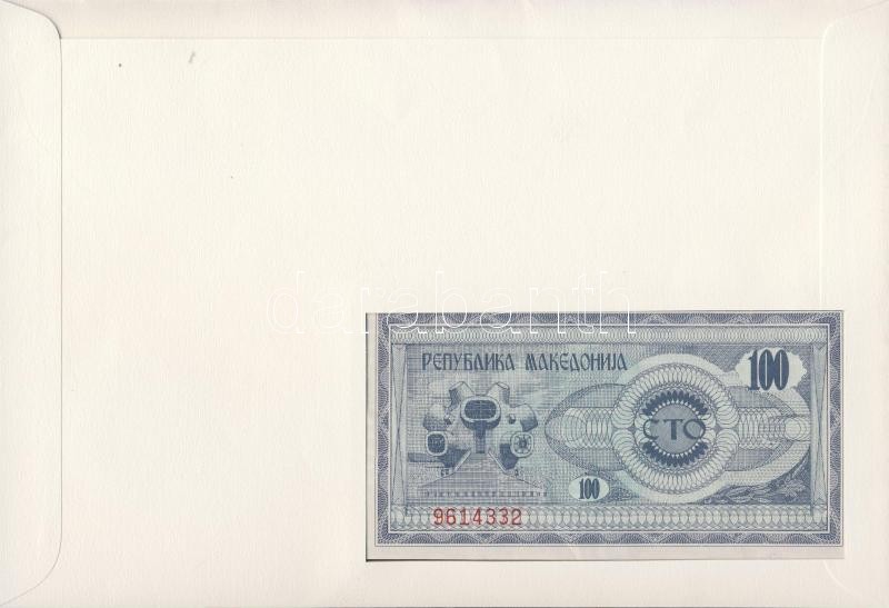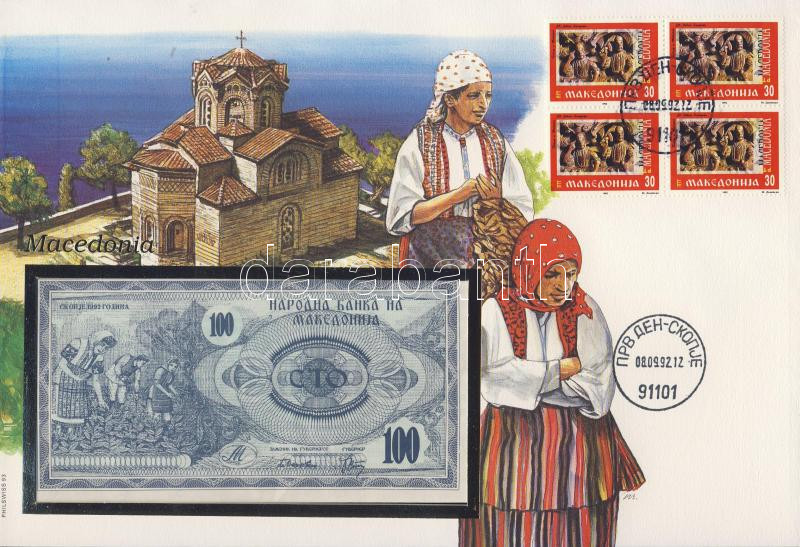 Leírás: Makedónia 1992. 100D dekoratív, nagyalakú bankjegyes, bélyeges borítékon T:I
