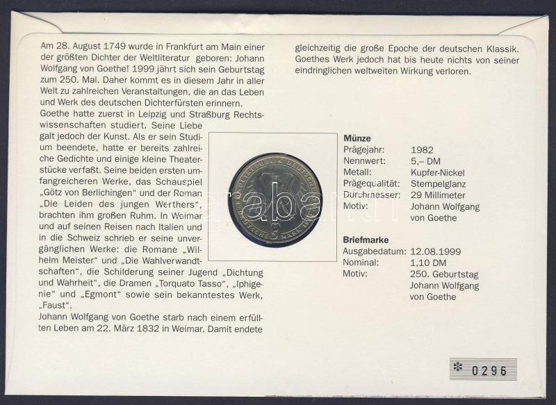 Leírás: NSZK 1982. 5M "Goethe" bélyeges érmés borítékon elsőnapi bélyegzővel, hátoldali ismertető tanúsítvánnyal T:1