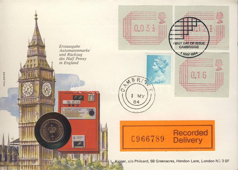 Leírás: Nagy-Britannia 1982. 1/2p érmés, bélyeges borítékon, automata bélyegekkel, ajánlott matricával, elsőnapi bélyegzővel T:1