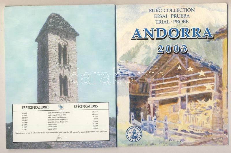 Leírás: Andorra 2003. 1c,2c,5c,10c,20c,50c,1€,2€ próbaveretek, szettben, díszkiadásban T:BU Csak 16.000db!