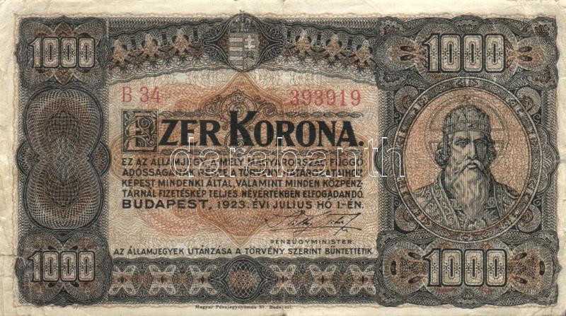 Leírás: 1923. 1000K "Magyar Pénzjegy..." T:III/IV+