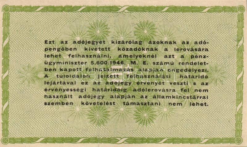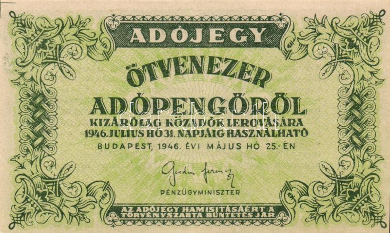 Leírás: 1946. 50.000AP barnásfehér vízjeles papíron, sorozat- és sorszám nélkül, hátlap világoszöld képnyomat, vízjel fejtetőn balra áll T:I