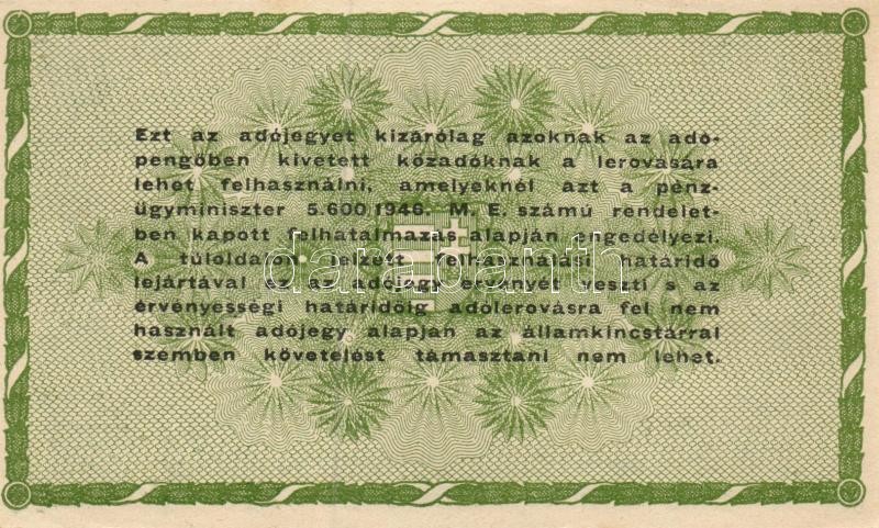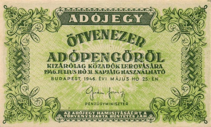 Leírás: 1946. 50.000AP barnásfehér vízjeles papíron, sorozat- és sorszám nélkül, vízjel talpa jobbra áll, de tükörkép T:I