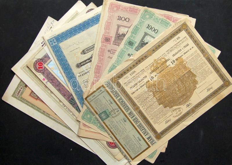Leírás: Kis tétel, benne részvények, kötvények, értékapapírok 1876-1995-ig, 9db magyar + 6db külföldi