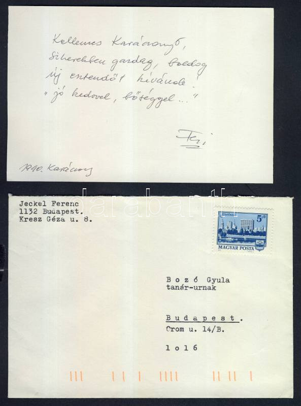 Leírás: Jeckel Ferenc festőművész üdvözlő sorai saját grafikáján