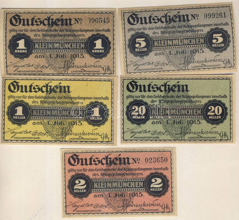 Leírás: Ausztria/Kleinmünchen/hadifogolytábor 1915. 1H, 2H, 5H, 20H, 1K 5klf bankjegy T:I