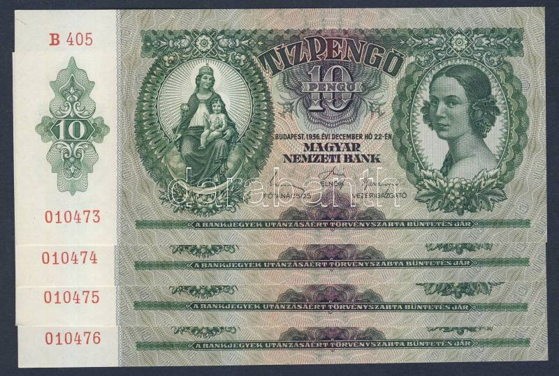 1936. 10P (4x) egymás utáni sorszámokkal T:I https://www.darabanth.com/hu/116-Gyorsarveres/116.0/Numizmatika/Osztrakmagyar-bankjegyek-magyar-es-magyar-vonatkozasu-bankjegyek~332/1936-10P-4x-egymas-utani-sorszamokkal-TI~II303400